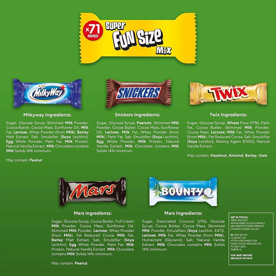 TWIX: Sugar, Glucose Syrup, WHEAT Flour, Palm Fat, Skimmed MILK Powder, Cocoa Butter, Cocoa Mass, WHEY Permeate (MILK), MILK Fat, Fat-Reduced Cocoa Powder, Salt, Emulsifier (SOYA Lecithin), Raising Agent (E500), Flavouring. MILKYWAY: Sugar, Glucose Syrup, Skimmed MILK Powder, Cocoa Butter, Cocoa Mass, Sunflower Oil, Whey Permeate (MILK), MILK Fat, BARLEY Malt Extract, Palm Fat, Salt, EGG White Powder, Emulsifier (SOYA Lecithin). SNICKERS: Sugar, Glucose Syrup, PEANUTS, Skimmed MILK Powder, Cocoa Butter, Cocoa Mass, Whey Permeate (MILK), Sunflower Oil, MILK Fat, Palm Fat, Salt, Emulsifier (SOYA Lecithin), EGG WHITE Powder. BOUNTY: Sugar, Desiccated Coconut, Glucose Syrup, Cocoa Butter, Cocoa Mass, Skimmed MILK Powder, Whey Permeate (MILK), Emulsifiers (SOYA Lecithin, E471), MILK Fat, Humectant (Glycerol), Palm Fat, Salt. MARS: sugar, glucose syrup, skimmed MILK powder, cocoa butter, cocoa mass, sunflower oil, WHEY PERMEATE (MILK), palm fat, MILK fat, fat-reduced cocoa powder, BARLEY MALT extract, salt, emulsifier (SOYA lecithin), EGG WHITE powder.